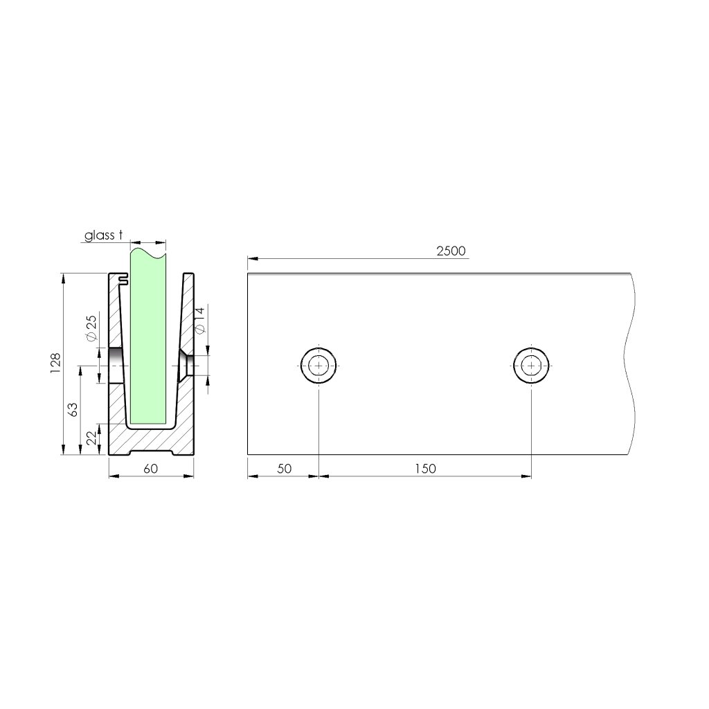AL kotviaci profil pre sklo, bočné kotvenie, povrch brúsený a eloxovaný, bez príslušenstva.Dodatočné parametre