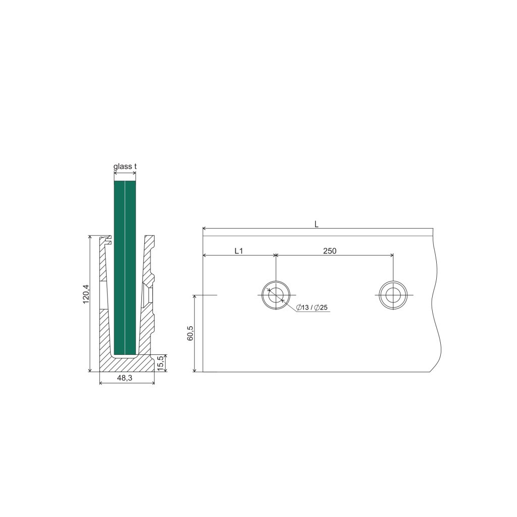 AL kotviaci profil pre sklo, bočné kotvenie, povrch brúsený a eloxovaný, bez príslušenstva.Dodatočné parametre