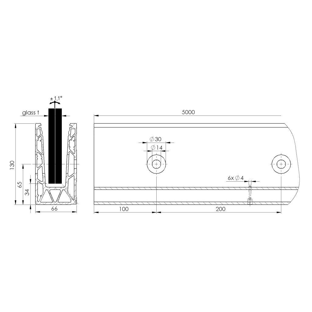 Al. kotviaci profil ELOX 130/66mm pre sklo T=12 až 17,52mm, kotvenie z boku, nastaviteľný sklon skla. Dodávané bez tesnení.Dodatočné parametre