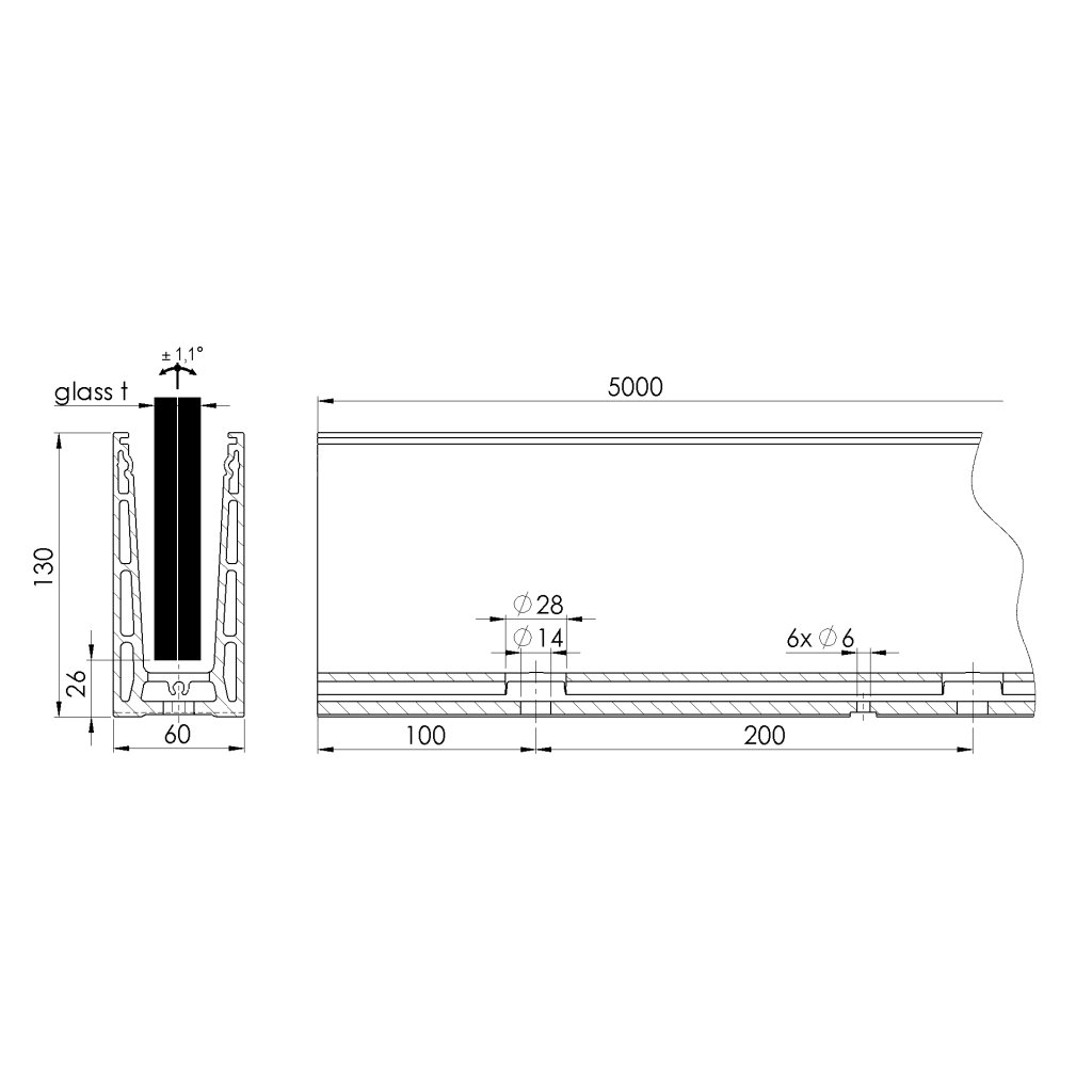 Al. kotviaci profil ELOX 130/60mm pre sklo T=12 až 21,52mm, kotvenie z vrchu do podlahy, nastaviteľný sklon skla. Dodávané v dĺžkach L5000mm (25ks otvorov d14mm pre kotvenie). Dodávané bez tesnení.Povrchová úprava ELOX - brus.Dodatočné parametre