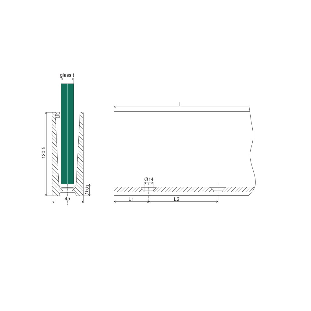 AL kotviaci profil pre sklo, vrchné kotvenie, povrch brúsený a eloxovaný, bez príslušenstva.Dodatočné parametre