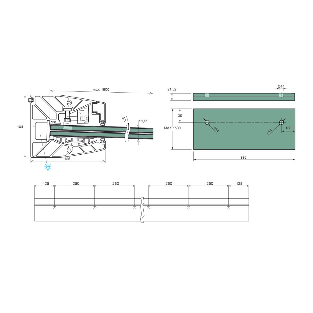 Presklená strieška hliník pre bezpečnostvé sklo lepené 21,52, zataženie 1,6kN/m2, priemer montážnych otvorov D14mm, Hliníková lišta pre sklenený prístrešok dodávaná bez skla. Sada obsahuje profil, záslepky, tesnenie a potrebné diely pre konečnú montáž skla.Doplňkové parametry