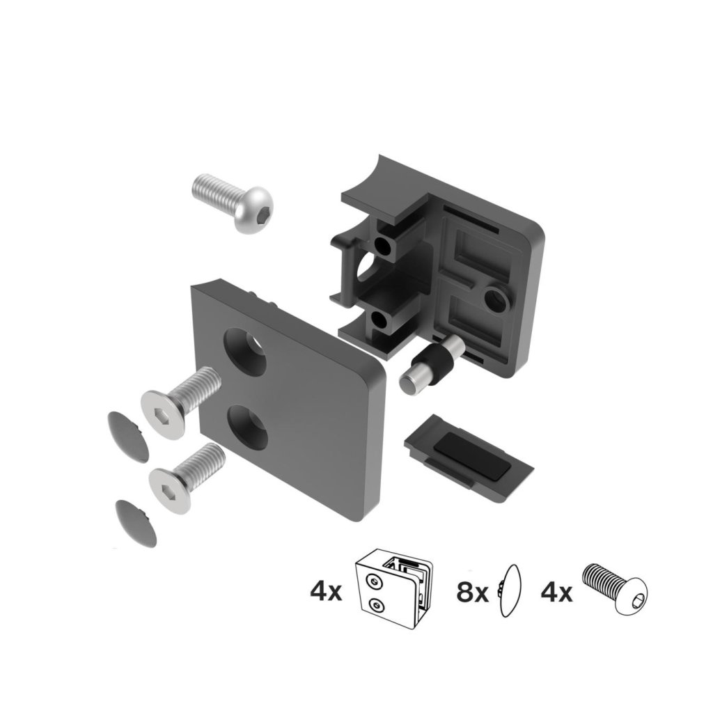 SET4 obsahuje 4ks drziak skla farba čierna v rozobratom stave + 8ks skrutky A2 DIN7991 M6x16 + 8ks krytky PVC farba čierna na prekrytie skrutiek A2 DIN7991 M6x16 + 4ks skrutky A2 DIN 7380 M8x20. Dziak vyplne skla (plechu, tabuľovej vyplne). Držanie skla (poistenie voči vypadnutiu): zverny spoj (doporucene pouzitie pri vrchnom kotveni) alebo zverny spoj + kolik (doporucene pouzitie pre bocne kotvenie) alebo zverny spoj + bezpečnostná platnicka so zamkom pri montazi - ochrana proti vypadnutiu platnicky (doporucene pouzitie pre bocne kotvenie). Držiak neobsahuje tesnenie (nutnost dokupit 2ks tesneni pre držiak podla hrubky skla) a krytky pre skrutky.Dodatočné parametre