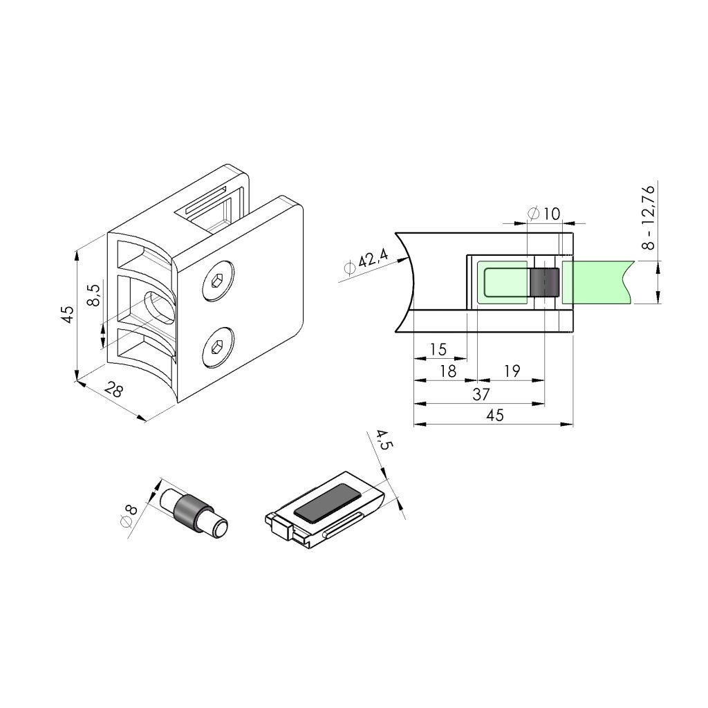 Držiak sklenenej (plechovej, tabuľovej) výplne je konštrukčný prvok používaný na upevnenie a stabilizáciu sklenenej alebo plechovej výplne v rôznych konštrukciách, ako sú zábradlia, balkóny alebo schodiská. Tento držiak zaisťuje pevné a bezpečné prichytenie výplne, čím zvyšuje celkovú stabilitu a bezpečnosť konštrukcie. Sú súčasťou moderných architektonických riešení, ktoré kombinujú funkčnosť, bezpečnosť a estetický vzhľad. Pri výbere držiaka je dôležité zvážiť jeho materiál, dizajn, funkčnosť a kompatibilitu s konkrétnou výplňou a celkovou konštrukciou. Držanie vyplne - poistenie voči vypadnutiu je dosiahnuté pomocou zverného spoja (doporučené použitie pri vrchnom kotveni) alebo zverny spoj + kolik (doporučené použitie pre bočne kotvenie) alebo zverny spoj + bezpečnostná platnicka (doporucene pouzitie pre bocne kotvenie). Držiak neobsahuje tesnenie (nutnost dokupit 2ks tesneni podla hrubky skla) a krytky pre skrutky.Dodatočné parametre