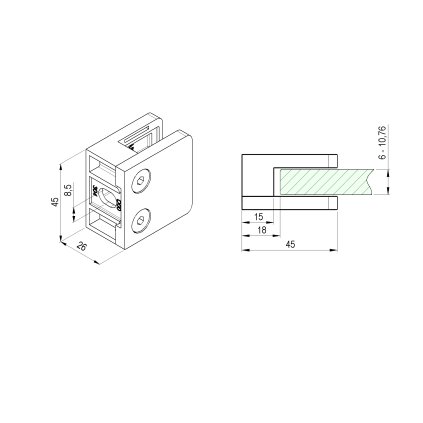 SET4 obsahuje 4ks drziak skla v rozobratom stave + 8ks skrutky A2 DIN7991 M6x16 + 8ks krytky PVC farba siva na prekrytie skrutiek A2 DIN7991 M6x16 + 4ks skrutky A2 DIN 7380 M8x20. Drziak vyplne skla (plechu, tabuľovej vyplne). Držanie skla (poistenie voči vypadnutiu): zverny spoj (doporucene pouzitie pri vrchnom kotveni) alebo zverny spoj + kolik (doporucene pouzitie pre bocne kotvenie) alebo zverny spoj + bezpečnostná platnicka so zamkom pri montazi - ochrana proti vypadnutiu platnicky (doporucene pouzitie pre bocne kotvenie). Držiak neobsahuje tesnenie (nutnost dokupit 2ks tesneni podla hrubky skla) a krytky pre skrutky.Dodatočné parametre