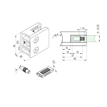 SET4 obsahuje 4ks drziak skla v rozobratom stave + 8ks skrutky A2 DIN7991 M6x16 + 8ks krytky PVC farba siva na prekrytie skrutiek A2 DIN7991 M6x16 + 4ks skrutky A2 DIN 7380 M8x20. Dziak vyplne skla (plechu, tabuľovej vyplne). Držanie skla (poistenie voči vypadnutiu): zverny spoj (doporucene pouzitie pri vrchnom kotveni) alebo zverny spoj + kolik (doporucene pouzitie pre bocne kotvenie) alebo zverny spoj + bezpečnostná platnicka so zamkom pri montazi - ochrana proti vypadnutiu platnicky (doporucene pouzitie pre bocne kotvenie). Držiak neobsahuje tesnenie (nutnost dokupit 2ks tesneni podla hrubky skla) a krytky pre skrutky.Dodatočné parametre