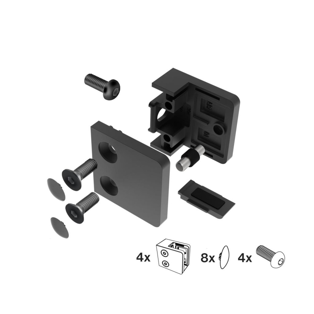 Držiak sklenenej (plechovej, tabuľovej) výplne je konštrukčný prvok používaný na upevnenie a stabilizáciu sklenenej alebo plechovej výplne v rôznych konštrukciách, ako sú zábradlia, balkóny alebo schodiská. Tento držiak zaisťuje pevné a bezpečné prichytenie výplne, čím zvyšuje celkovú stabilitu a bezpečnosť konštrukcie. Sú súčasťou moderných architektonických riešení, ktoré kombinujú funkčnosť, bezpečnosť a estetický vzhľad. Pri výbere držiaka je dôležité zvážiť jeho materiál, dizajn, funkčnosť a kompatibilitu s konkrétnou výplňou a celkovou konštrukciou. Držanie vyplne - poistenie voči vypadnutiu je dosiahnuté pomocou zverného spoja (doporučené použitie pri vrchnom kotveni) alebo zverny spoj + kolik (doporučené použitie pre bočne kotvenie) alebo zverny spoj + bezpečnostná platnicka (doporucene pouzitie pre bocne kotvenie). Držiak neobsahuje tesnenie (nutnost dokupit 2ks tesneni pre drziak podla hrubky skla). SET4 obsahuje 4ks drziak skla v rozobratom stave + 8ks skrutky A2 DIN7991 M6x16 + 8ks krytky PVC farba siva na prekrytie skrutiek A2 DIN7991 M6x16 + 4ks skrutky A2 DIN 7380 M8x20.Dodatočné parametre