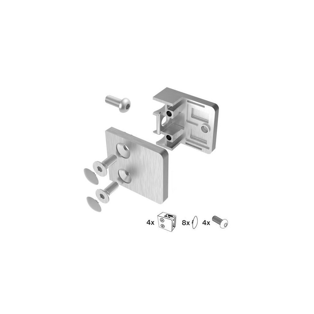 Držiak sklenenej (plechovej, tabuľovej) výplne je konštrukčný prvok používaný na upevnenie a stabilizáciu sklenenej alebo plechovej výplne v rôznych konštrukciách, ako sú zábradlia, balkóny alebo schodiská. Tento držiak zaisťuje pevné a bezpečné prichytenie výplne, čím zvyšuje celkovú stabilitu a bezpečnosť konštrukcie. Sú súčasťou moderných architektonických riešení, ktoré kombinujú funkčnosť, bezpečnosť a estetický vzhľad. Pri výbere držiaka je dôležité zvážiť jeho materiál, dizajn, funkčnosť a kompatibilitu s konkrétnou výplňou a celkovou konštrukciou. Držanie vyplne - poistenie voči vypadnutiu je dosiahnuté pomocou zverného spoja (doporučené použitie pri vrchnom kotveni). SET4 obsahuje 4ks drziak skla v rozobratom stave + 8ks skrutky A2 DIN7991 M6x16 + 8ks krytky PVC farba siva na prekrytie skrutiek A2 DIN7991 M6x16 + 4ks skrutky A2 DIN 7380 M8x20. Držiak neobsahuje tesnenie (nutnost dokupit 2ks tesneni podla hrubky skla).Dodatočné parametre