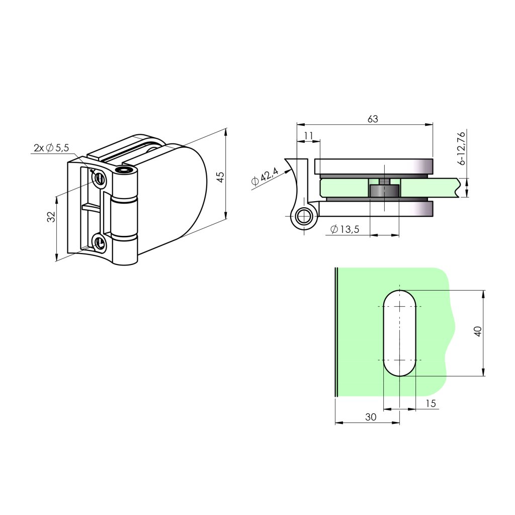 Nerezovy zaves - držiak skla pre sklo T= 6 až 12,76mm, kotvenie na ruru D 42,4mm. Materiál AISI 316 brus K320.Dodatočné parametre
