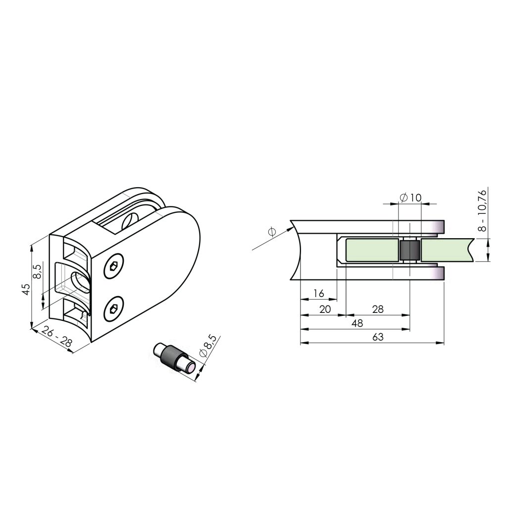 Držiak sklenenej (plechovej, tabuľovej) výplne je konštrukčný prvok používaný na upevnenie a stabilizáciu sklenenej alebo plechovej výplne v rôznych konštrukciách, ako sú zábradlia, balkóny alebo schodiská. Tento držiak zaisťuje pevné a bezpečné prichytenie výplne, čím zvyšuje celkovú stabilitu a bezpečnosť konštrukcie. Sú súčasťou moderných architektonických riešení, ktoré kombinujú funkčnosť, bezpečnosť a estetický vzhľad. Pri výbere držiaka je dôležité zvážiť jeho materiál, dizajn, funkčnosť a kompatibilitu s konkrétnou výplňou a celkovou konštrukciou. Držanie vyplne - poistenie voči vypadnutiu je dosiahnuté pomocou zverného spoja (doporučené použitie pri vrchnom kotveni) alebo zverny spoj + kolik (doporučené použitie pre bočne kotvenie). Držiak neobsahuje tesnenie (nutnost dokupit 2ks tesneni podla hrubky skla) a krytky pre skrutky.Dodatočné parametre