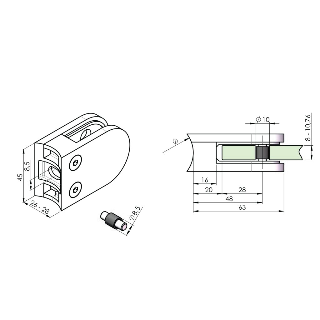 Držiak sklenenej (plechovej, tabuľovej) výplne je konštrukčný prvok používaný na upevnenie a stabilizáciu sklenenej alebo plechovej výplne v rôznych konštrukciách, ako sú zábradlia, balkóny alebo schodiská. Tento držiak zaisťuje pevné a bezpečné prichytenie výplne, čím zvyšuje celkovú stabilitu a bezpečnosť konštrukcie. Sú súčasťou moderných architektonických riešení, ktoré kombinujú funkčnosť, bezpečnosť a estetický vzhľad. Pri výbere držiaka je dôležité zvážiť jeho materiál, dizajn, funkčnosť a kompatibilitu s konkrétnou výplňou a celkovou konštrukciou. Držanie vyplne - poistenie voči vypadnutiu je dosiahnuté pomocou zverného spoja (doporučené použitie pri vrchnom kotveni) alebo zverného spoja + kolika (doporucene pouzitie pre bocne kotvenie). Držiak neobsahuje tesnenie (nutnost dokupit 2ks tesneni podla hrubky skla) a krytky pre skrutky.Dodatočné parametre