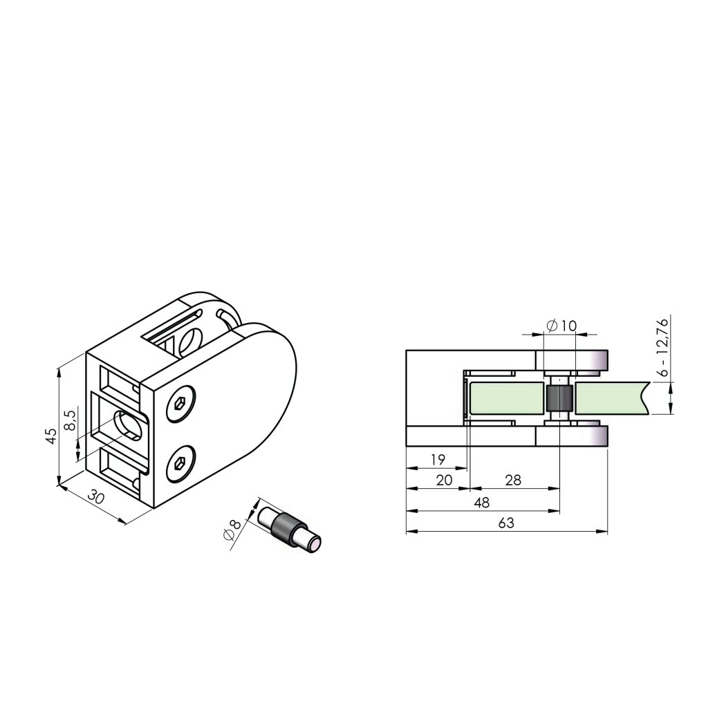 Držiak sklenenej (plechovej, tabuľovej) výplne je konštrukčný prvok používaný na upevnenie a stabilizáciu sklenenej alebo plechovej výplne v rôznych konštrukciách, ako sú zábradlia, balkóny alebo schodiská. Tento držiak zaisťuje pevné a bezpečné prichytenie výplne, čím zvyšuje celkovú stabilitu a bezpečnosť konštrukcie. Sú súčasťou moderných architektonických riešení, ktoré kombinujú funkčnosť, bezpečnosť a estetický vzhľad. Pri výbere držiaka je dôležité zvážiť jeho materiál, dizajn, funkčnosť a kompatibilitu s konkrétnou výplňou a celkovou konštrukciou. Držanie vyplne - poistenie voči vypadnutiu je dosiahnuté pomocou zverného spoja (doporučené použitie pri vrchnom kotveni) alebo zverny spoj + kolik (doporučené použitie pre bočne kotvenie). Držiak neobsahuje tesnenie (nutnost dokupit 2ks tesneni podla hrubky skla) a krytky pre skrutky.Dodatočné parametre