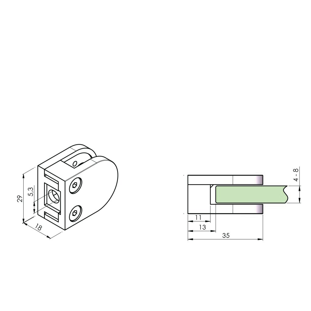 Držiak sklenenej (plechovej, tabuľovej) výplne je konštrukčný prvok používaný na upevnenie a stabilizáciu sklenenej alebo plechovej výplne v rôznych konštrukciách, ako sú zábradlia, balkóny alebo schodiská. Tento držiak zaisťuje pevné a bezpečné prichytenie výplne, čím zvyšuje celkovú stabilitu a bezpečnosť konštrukcie. Sú súčasťou moderných architektonických riešení, ktoré kombinujú funkčnosť, bezpečnosť a estetický vzhľad. Pri výbere držiaka je dôležité zvážiť jeho materiál, dizajn, funkčnosť a kompatibilitu s konkrétnou výplňou a celkovou konštrukciou. Držanie vyplne - poistenie voči vypadnutiu je dosiahnuté pomocou zverného spoja (doporučené použitie pri vrchnom kotveni). Držiak neobsahuje tesnenie (nutnost dokupit 2ks tesneni podla hrubky skla) a krytky pre skrutky.Dodatočné parametre