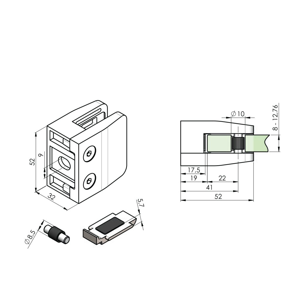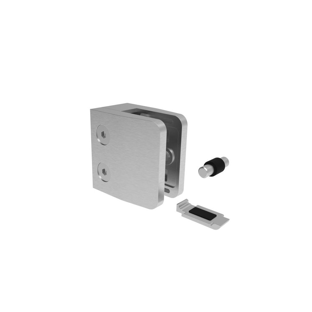Držiak sklenenej (plechovej, tabuľovej) výplne je konštrukčný prvok používaný na upevnenie a stabilizáciu sklenenej alebo plechovej výplne v rôznych konštrukciách, ako sú zábradlia, balkóny alebo schodiská. Tento držiak zaisťuje pevné a bezpečné prichytenie výplne, čím zvyšuje celkovú stabilitu a bezpečnosť konštrukcie. Sú súčasťou moderných architektonických riešení, ktoré kombinujú funkčnosť, bezpečnosť a estetický vzhľad. Pri výbere držiaka je dôležité zvážiť jeho materiál, dizajn, funkčnosť a kompatibilitu s konkrétnou výplňou a celkovou konštrukciou. Držanie vyplne - poistenie voči vypadnutiu je dosiahnuté pomocou zverného spoja (doporučené použitie pri vrchnom kotveni) alebo zverny spoj + kolik (doporučené použitie pre bočne kotvenie) alebo zverny spoj + bezpečnostná platnicka (doporucene pouzitie pre bocne kotvenie). Držiak neobsahuje tesnenie (nutnost dokupit 2ks tesneni pre drziak podla hrubky skla).Dodatočné parametre