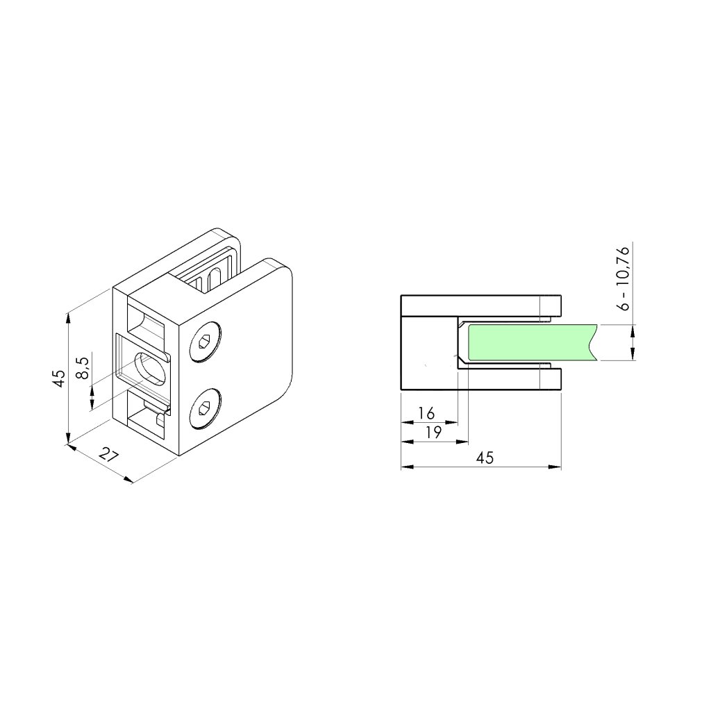 Držiak výplne skla (plechu, tabuľovej vyplne). Držanie výplne (poistenie voči vypadnutiu) je dosiahnuté pomocou zvernného spoja (doporučené použitie pri vrchnom kotveni). Držiak neobsahuje tesnenie - nutnosť dokupit 2ks tesneni podľa hrúbky skla a krytky pre skrutky.Dodatočné parametre