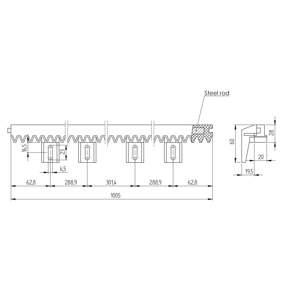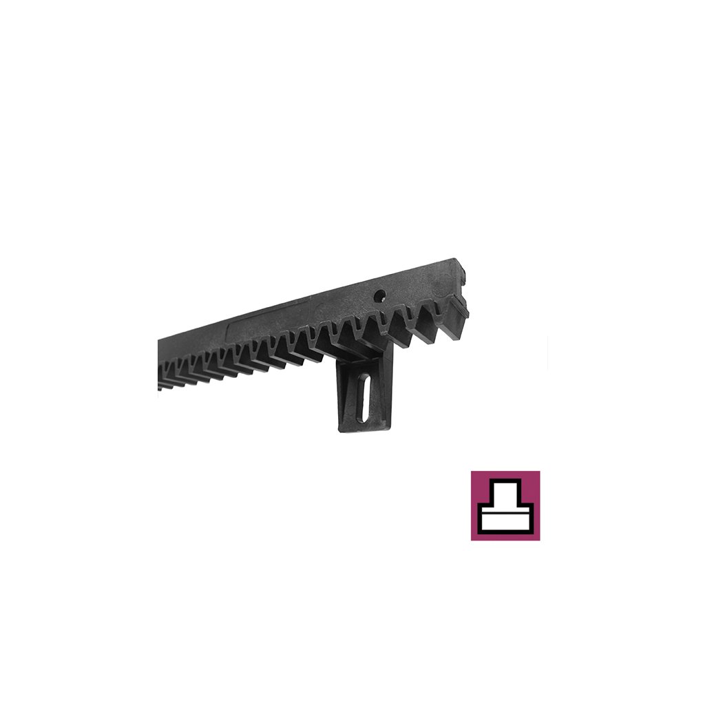 Ozubený nylonový hrebeň s oceľovým jadrom pre posuvné brány, odľahčený, so štyrmi úchytmi smerom nadol. Dodávaný bez skrutiek a podložiek.Dodatočné parametre