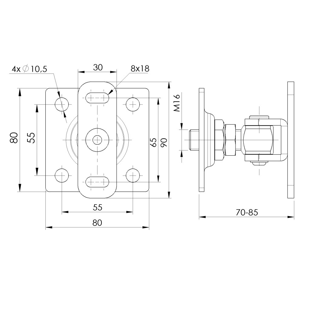 Nerezový nastaviteľný záves s kotviacou prírubou 80x80mm, závit M16. Jednoduchá regulácia závesu pomocou otočnej matice.Dodatočné parametre
