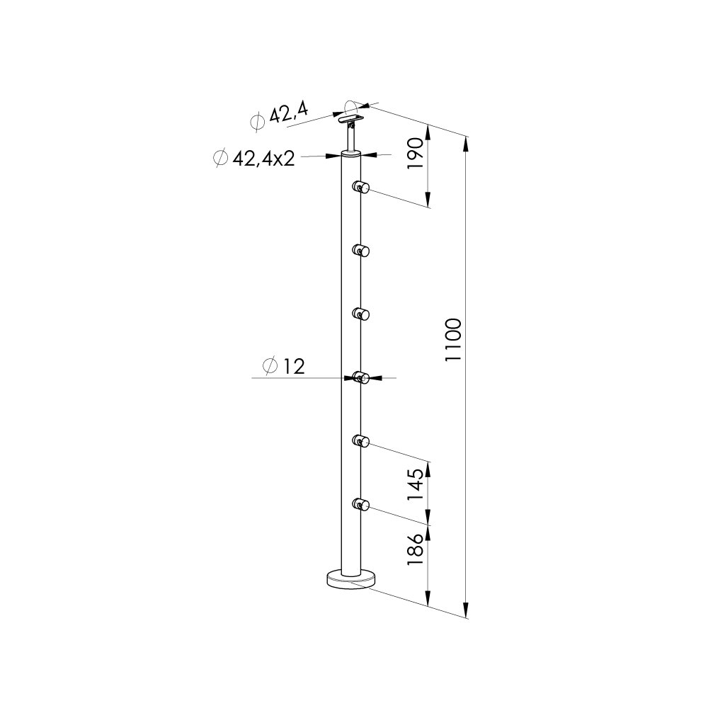 Nerezový stĺpik D42,4 mm pre madlo D42,4mm. Horizontálna výplň 5 x d12 mm. Vrchné kotvenie. Určené pre schodiskové zábradlie výšky 100 cm, pre montáž s max. prepadom do 12 m. Možnosť nastavenia sklonu výplne a madla.Dodatočné parametre