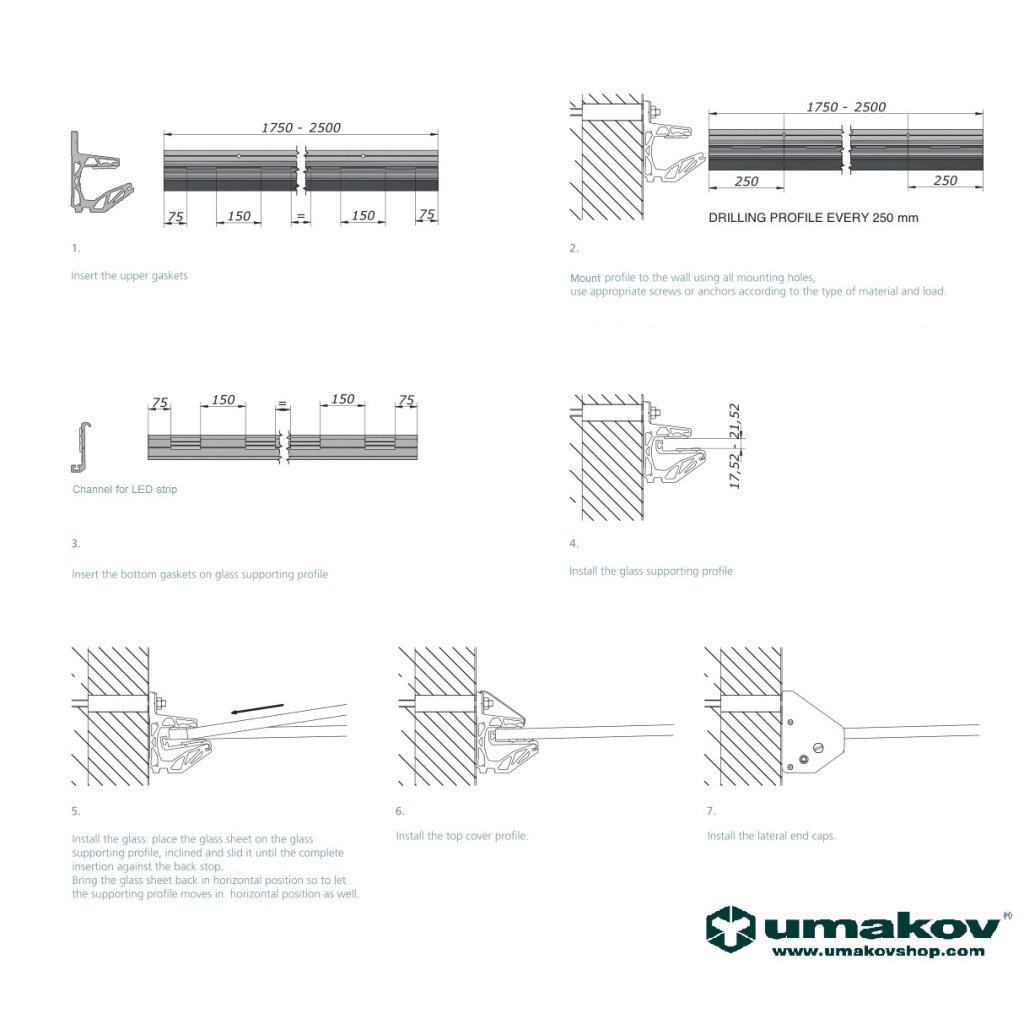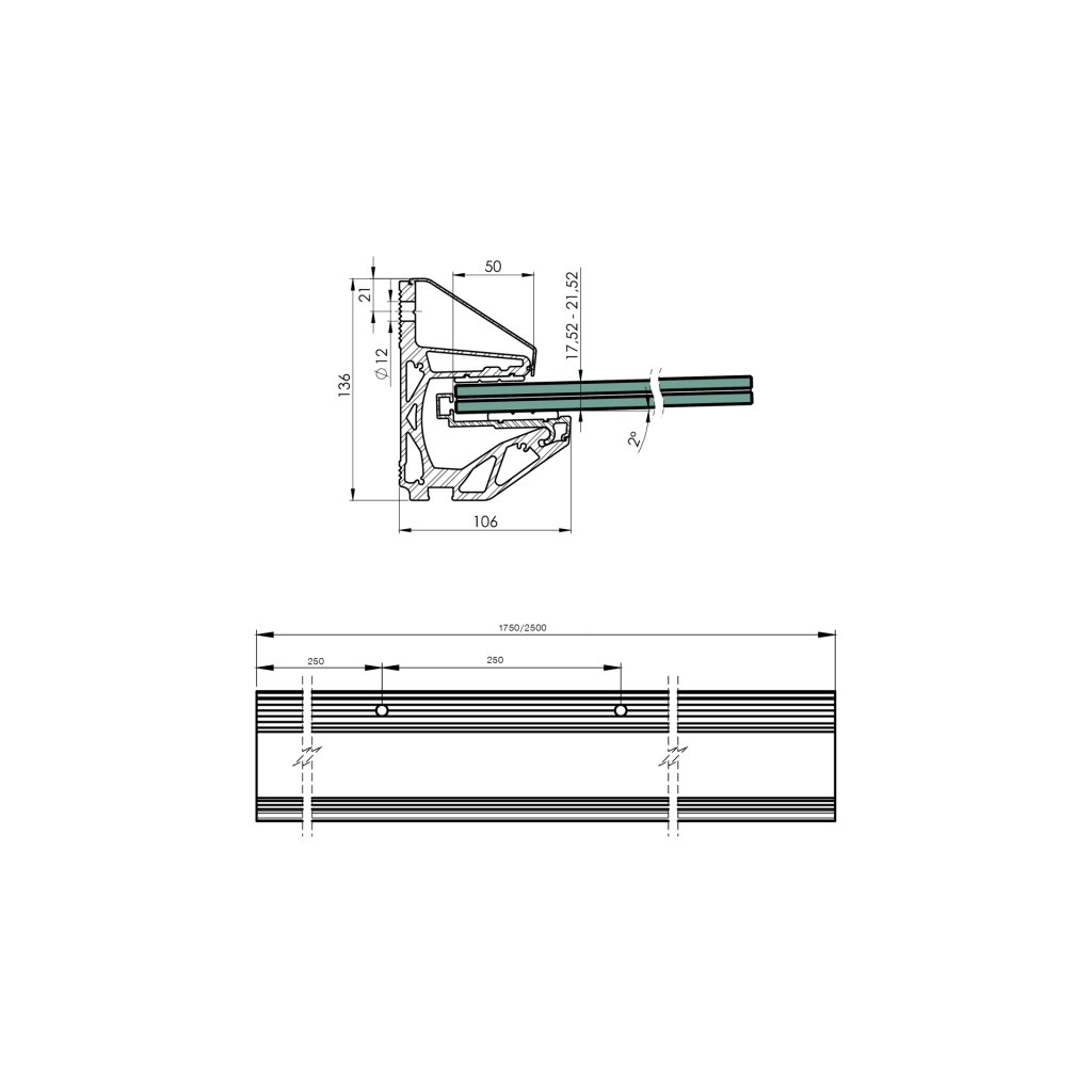 Presklená strieška hliník pre bezpečnostvé sklo lepené 17,52, zataženie 1,5kN/m2, samonosné sklo bez vŕtania bezpečnostných otvorov, LED, 88°. Hliníková lišta pre sklenený prístrešok dodávaná bez skla. Sada obsahuje profil, záslepky, tesnenie a potrebné diely pre konečnú montáž skla.Dodatočné parametre
