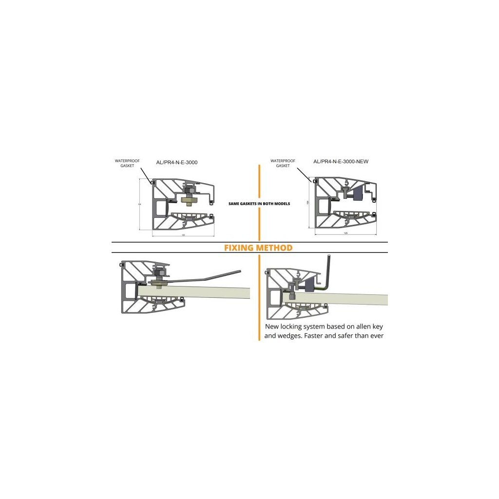 Presklená strieška hliník pre bezpečnostvé sklo lepené 21,52, zataženie 1,6kN/m2, priemer montážnych otvorov D14mm, Hliníková lišta pre sklenený prístrešok dodávaná bez skla. Sada obsahuje profil, záslepky, tesnenie a potrebné diely pre konečnú montáž skla.Dodatočné parametre