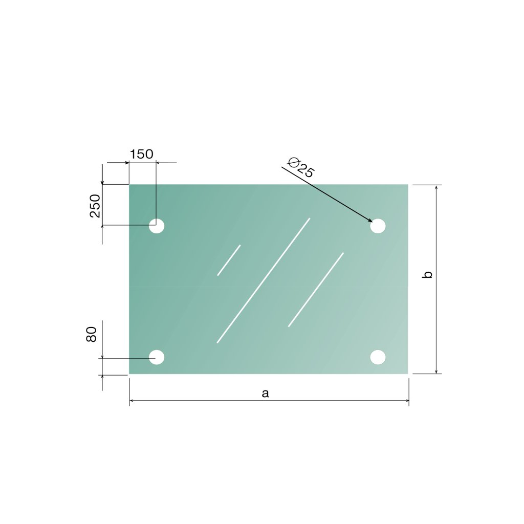Sklo s otvormi, kalené, lepené VSG/ESG, mliečná fólia, zrazené a leštené hrany.Dodatočné parametre