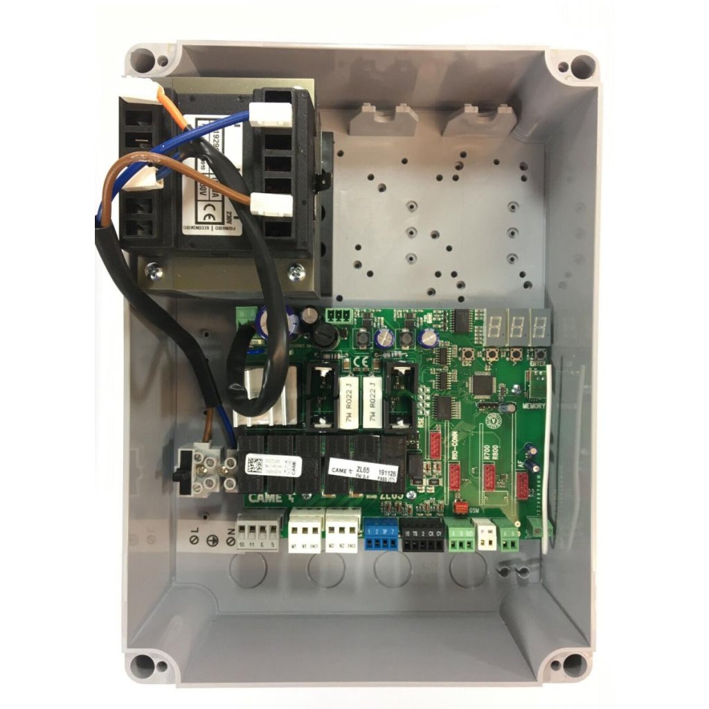 Skrinka s elektronikou CAME pre dvojkrídlovú bránu. Napájanie 230V. Elektronika má rozšírené funkcie. Rozdiel oproti ZA-3N - elektronika má funkciu spomalenie v koncových polohách.Dodatočné parametre