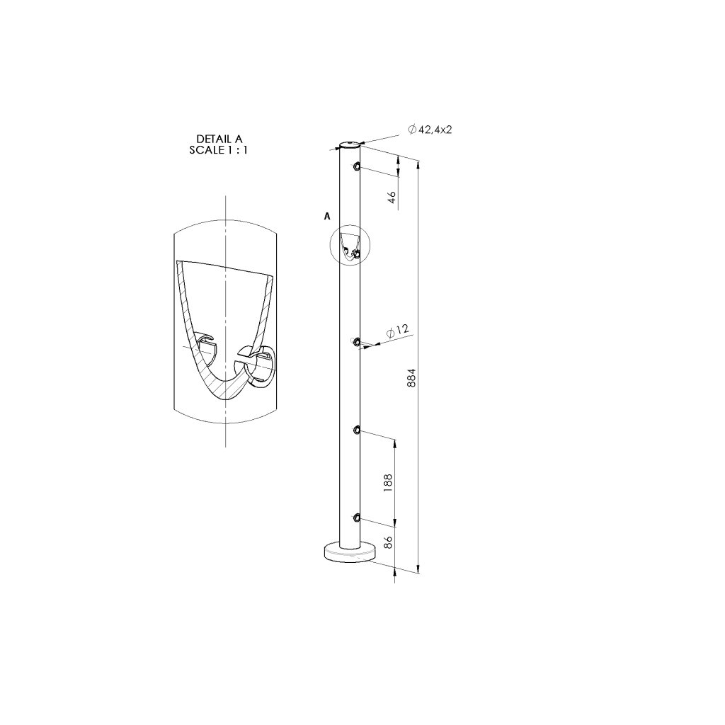 Nerezový stĺpik D42,4 mm. Vrchné kotvenie, horizontálna výplň 5 x d12 mm - osová. Určené pre rovné zábradlie výšky 100 cm, pre montáž s max. prepadom do 12 m.Dodatočné parametre