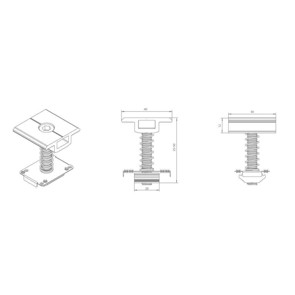Svorku je možné vložiť z hora do profilu. Nerezová zemniaca podložka s tŕňami naruší vrstvu eloxu čím zabezpečí vyrovnanie el. potencálov medzi panelmi a montážnym systémom. Pružina zabezpečí polohovanie na profile pred dotiahnutím.Dodatočné parametre