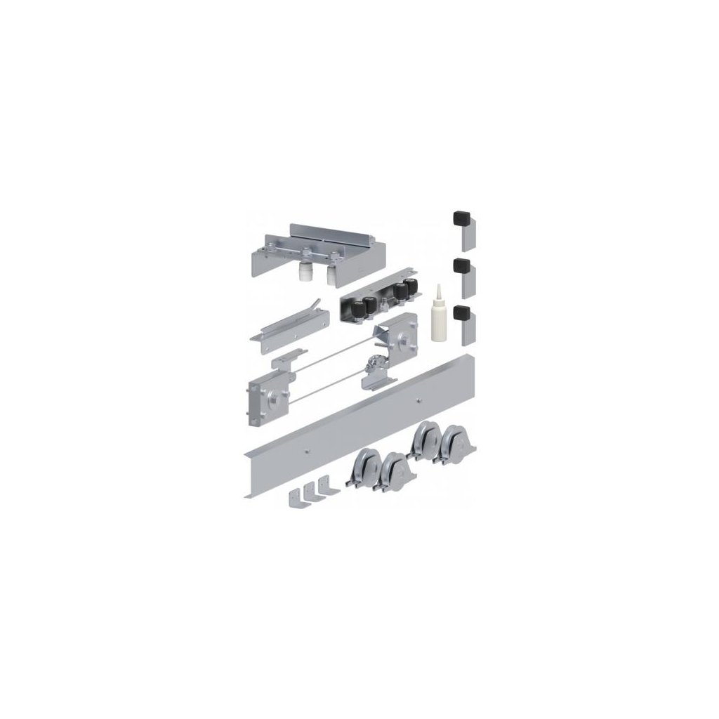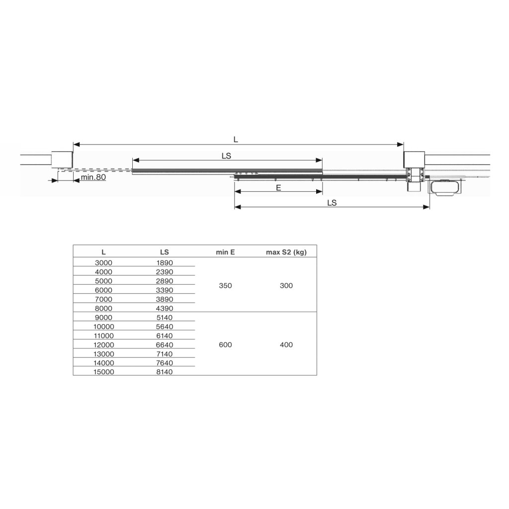 Teleskopický systém pre dvojdielnu kolieskovú bránu s prejazdom do 15m. Systém obsahuje: lankový prevod, 1x nastaviteľné horné vedenie, 2x vedenie + konzoly pre vodiaci U profil, 8x kryt, 3x koncový doraz, 4x pojazdové koliesko pre V koľajničku H/39V.Dodatočné parametre