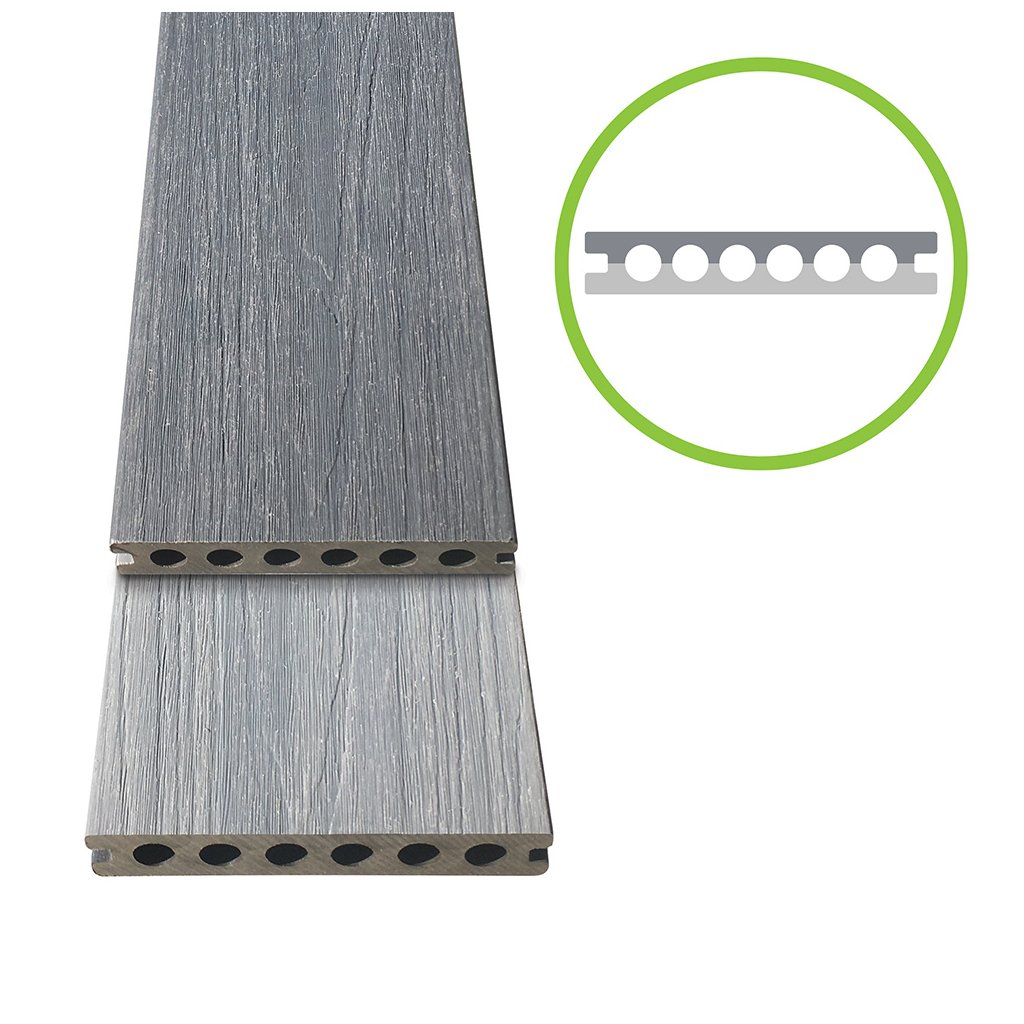 WPC doska obsahuje recyklované drevené vlákna 60%, plastový materiál HDPE (High Density PolyEthylen) 30% a 10% UV stabilizátorov a prísad, takže pri výrobe WPC dosky nie je vyrezaný žiadny strom.