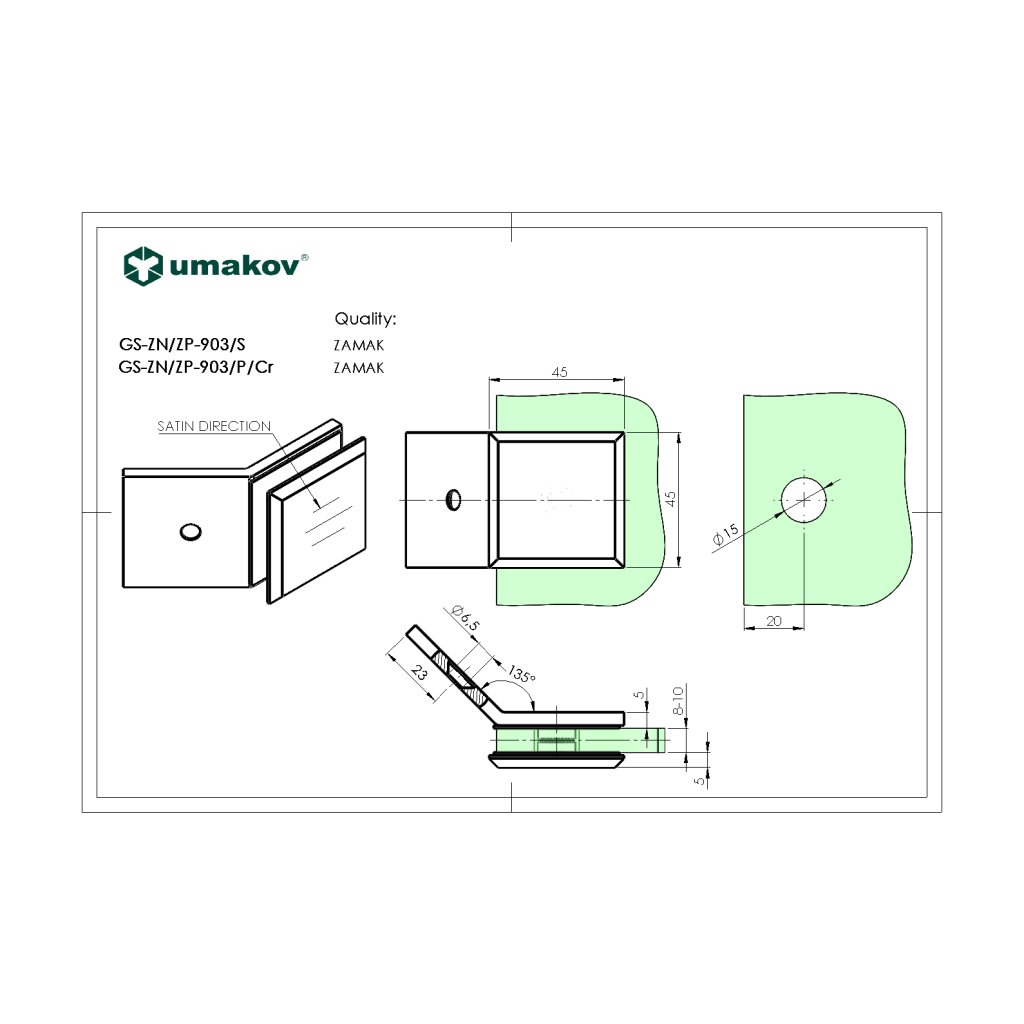 Zasklenie pevne - držiak skla, 135°,Zamak,T 8-10mm