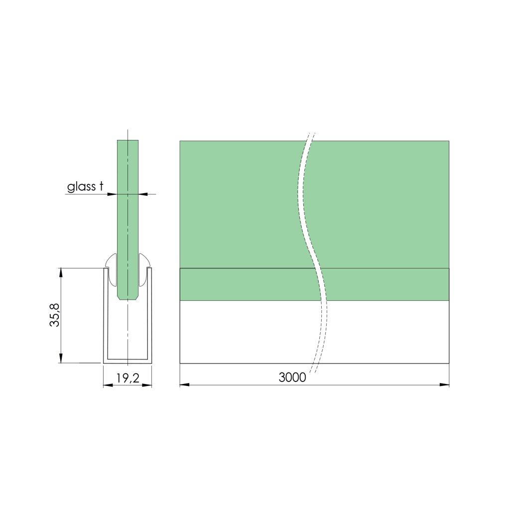 Hlinikový profil pre sklo hrúbky 10mm + tesnenia, hrúbka steny profilu 2mm, dodavané v dĺžke 3000 mmDodatočné parametre