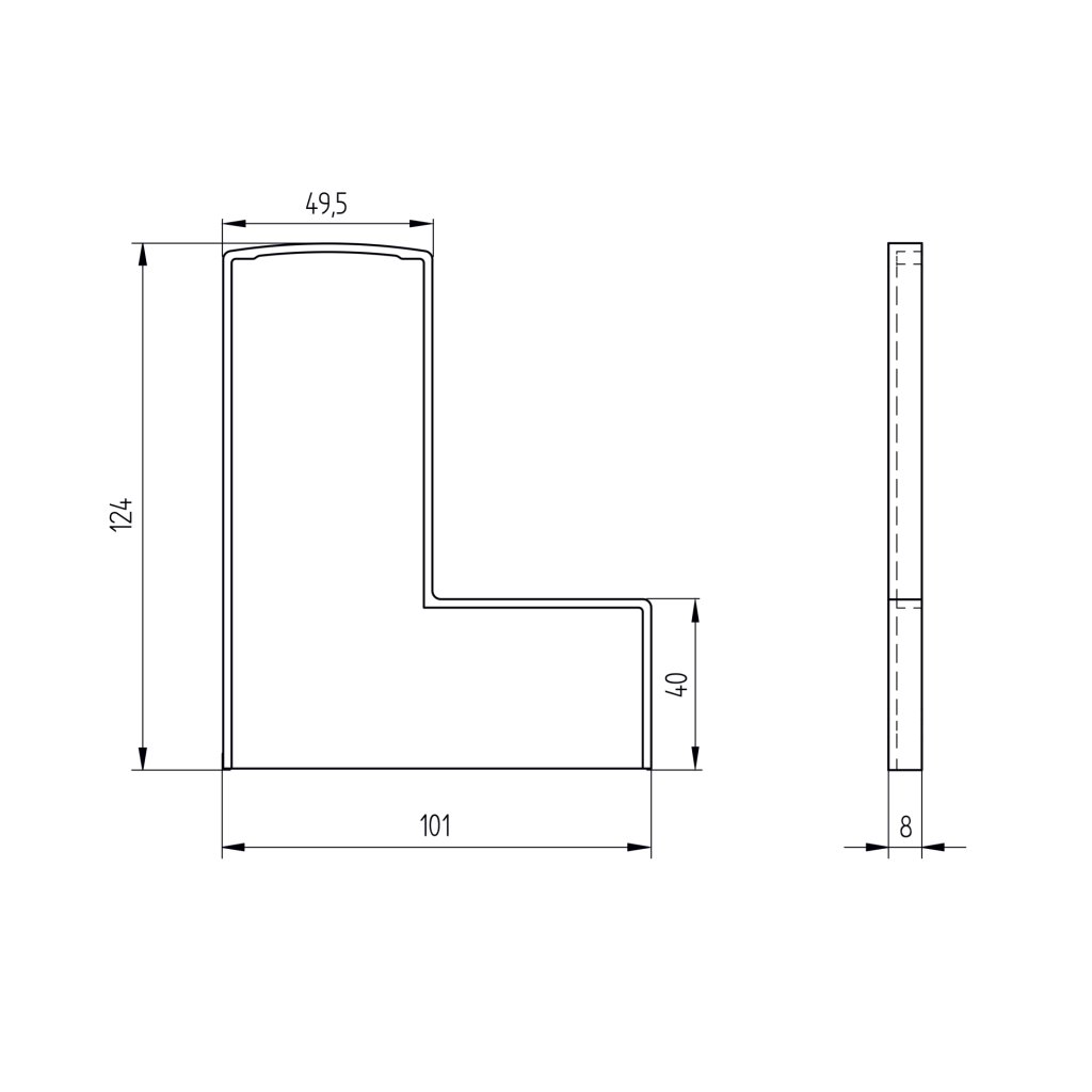 Záslepka (pravá strana) pre profil AL/0006-1250-S-E, AL/0006-2500-S-E, AL/0006-5000-S-E, AL/0006-6000-S-E a krycie lišty AL/0026-2500-S-E, AL/0026-5000-S-E, AL/0026-6000-S-E. Povrchová úprava: Brus, Efekt: ELOXDodatočné parametre
